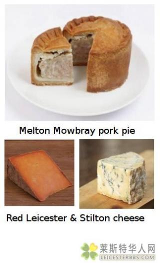 莱斯特郡有几种特产,其中最有名的要属Red Leicester cheese (红莱斯特芝士),Stilton (斯第尔顿奶酪),和Melton Mowbray pork pie (Melton Mowbray猪肉馅饼).